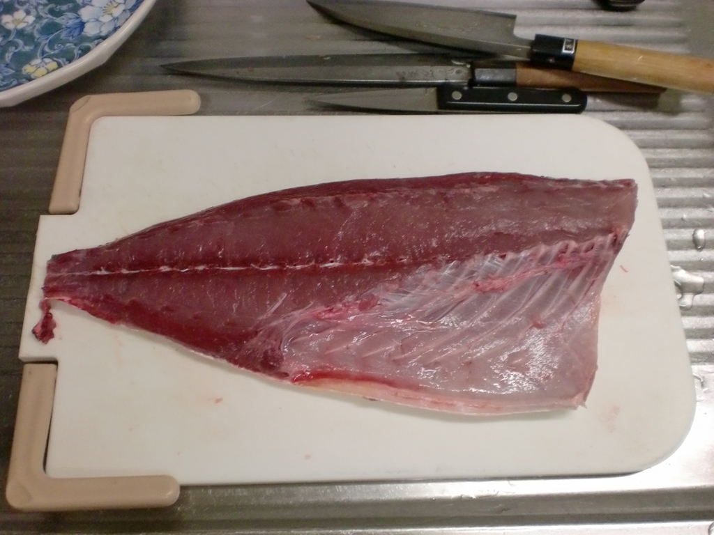 早速ワラサから解体開始!三枚に下ろした半身の状態です。これだけで中皿いっぱいの