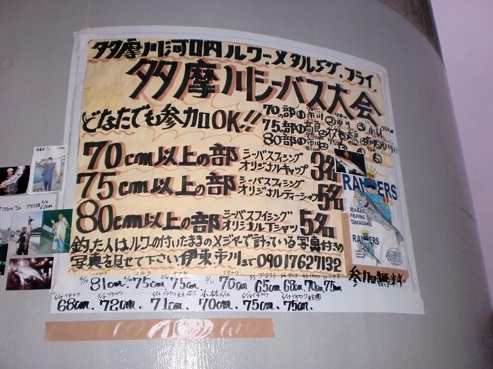 この張り紙の左側には多摩川で釣った人のシーバスとの2ショット写真がペタペタ貼ってありました。